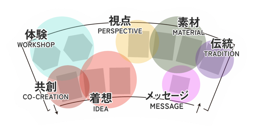 八尾市の企業の独自性、面白さを国内外へ広く発信するため、連綿と続いていく高い技術力、 伝統にふれる。創造力を刺激する着想や視点、 素材にふれる。「とにかくさわる」ことで、 来場者自身が未来につながるものづくりをしたくなる展示。
